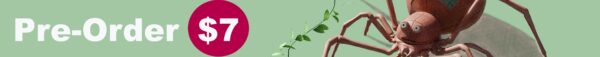 Advert for The Blossoming of the Big Tree, a novella by Dilman Dila, with two blurbs. It's a green advert, with a robotic spider as the main image, it is holding a flower.
